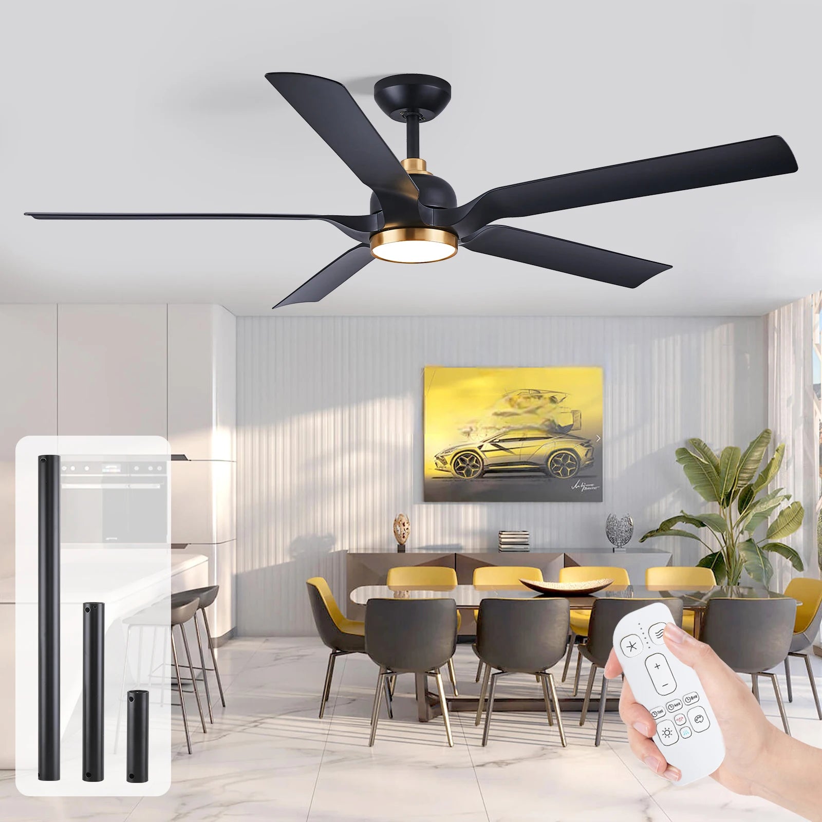 This Modern Large Ceiling Fan with light has 3 downrods(6'' 12'' 24'' ) , you can choose the proper down rod according to the ceiling height.