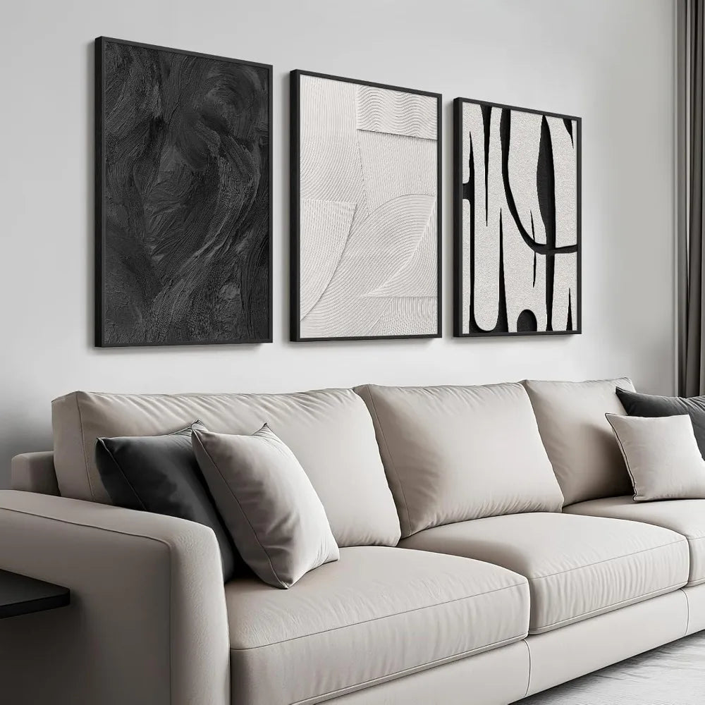 AS GREAT AS THE PICTURE: Our 2D wall art prints use high-quality inks to ensure that the product you receive is an exact match to the advertising image, providing a true representation of the design. This trio of abstract artworks features a rich dark monochrome on the left, sinuous white lines on a black backdrop in the center, and striking geometric forms with bold black-and-white contrasts on the right. Bask in minimalist allure.