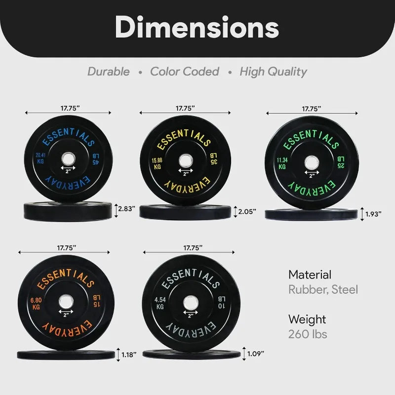Comprehensive Package: Unleash full-body potential with our 260 lbs bumper plates set; Includes (2) 10-lb, (2) 15-lb, (2) 25-lb, (2) 35-lb, and (2) 45-lb plates.
