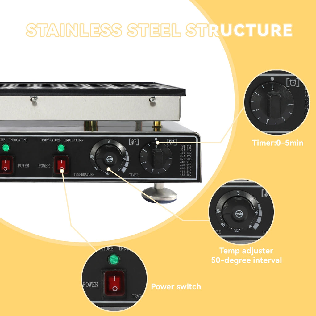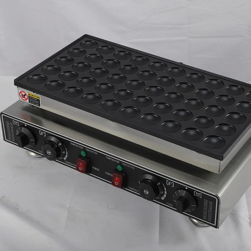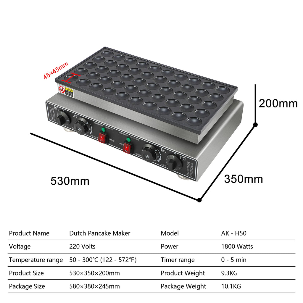 HIGH EFFICIENCY\u3011- The highly conductive cast-iron plate distributes heat evenly to provide golden crispy poffertjes, with a large baking area of 19.5"x10.2". Baking up to 50 dutch pancakes (\u03c61.8"x0.4") at once will only take you 3-5 minutes.