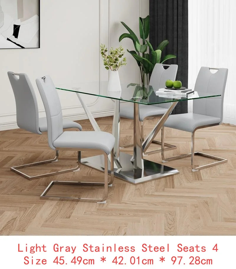 Product Name: Modern style glass dining table, elegant transparent design, sturdy stainless steel base, White dining chair set, with gold-plated chair legs, suitable for dining room and kitchen (set of 7)