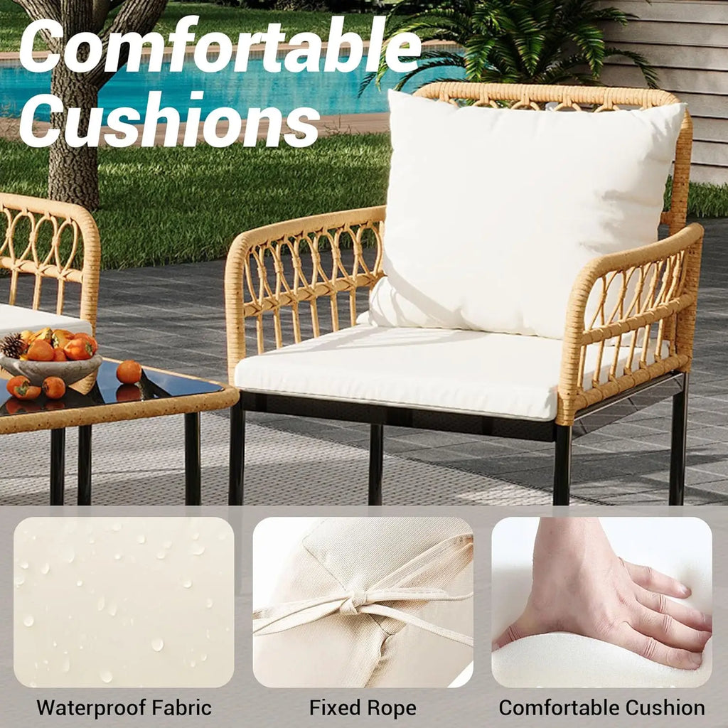 【Comfortable Cushions & Easy Maintenance】This 4 Pieces patio set is ergonomically designed, featuring thick, soft sponge cushions and soft back pillows for cloud-like comfort. The polyester covers are waterproof and fade-resistant, making daily cleaning and maintenance a breeze. The height-appropriate rattan-wrapped glass-top coffee table is sturdy yet lightweight and can be easily wiped clean.
