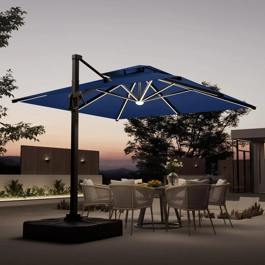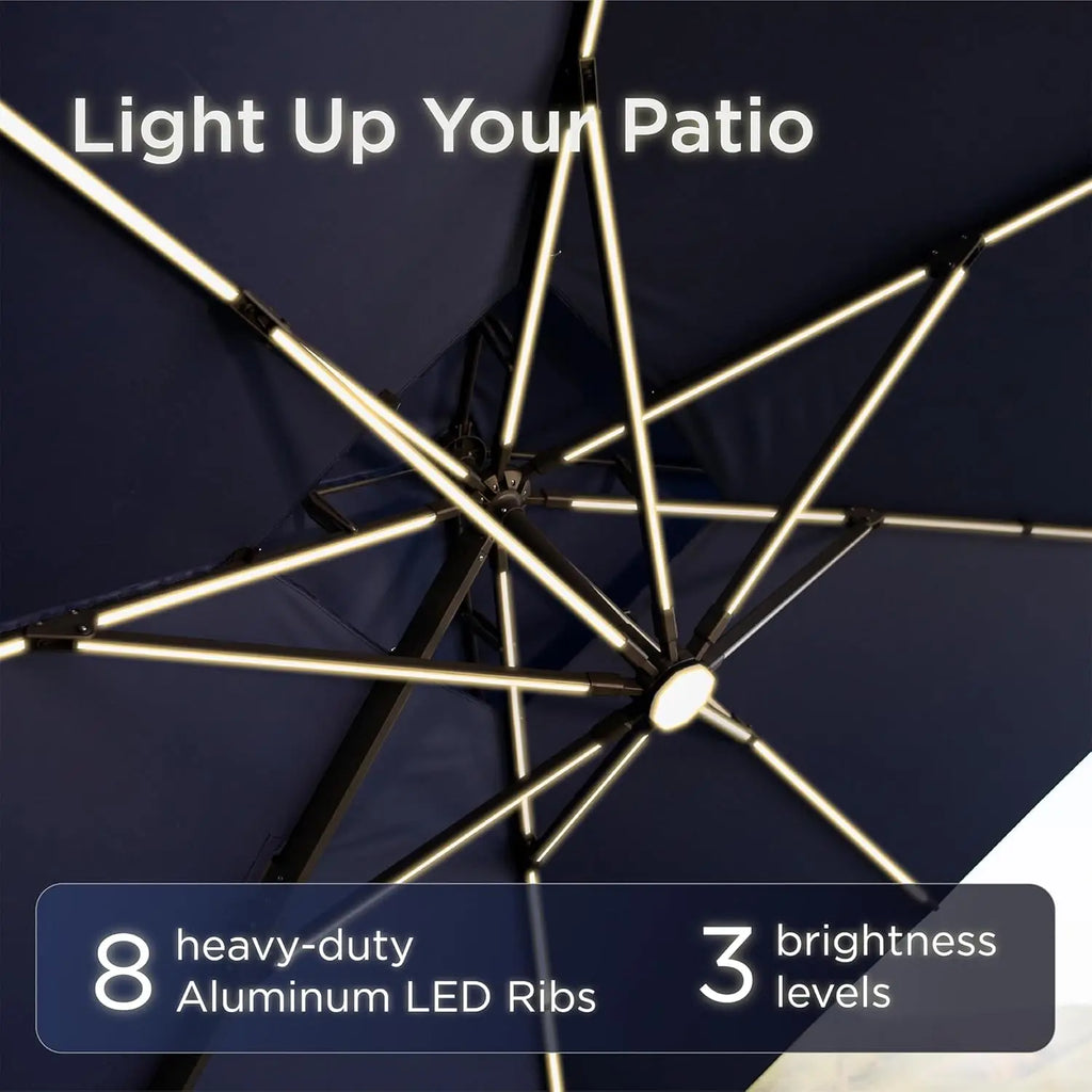 10 FT Cantilever Patio Umbrella with Lights: Fillable umbrella base is not included; The cantilever umbrella with 8 heavy-duty led ribs, 4-hour runtime (solar rechargeable), and 3 adjustable brightness modes; Ideal for outdoor comfort