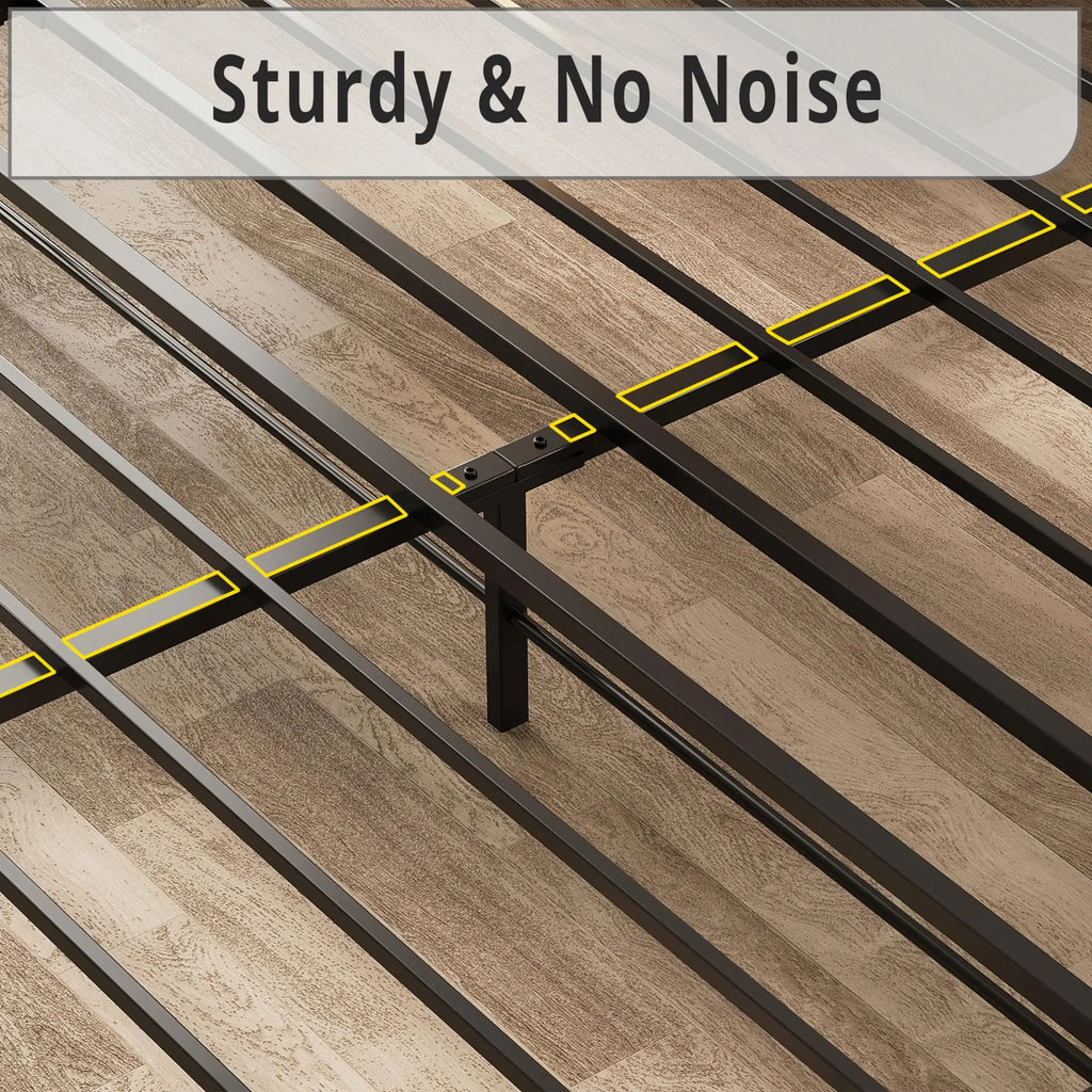 Heavy-duty metal slats reinforce the sturdiness and durability of the platform king bed structure. Providing optimum support for all types of mattresses without the use of a box spring.