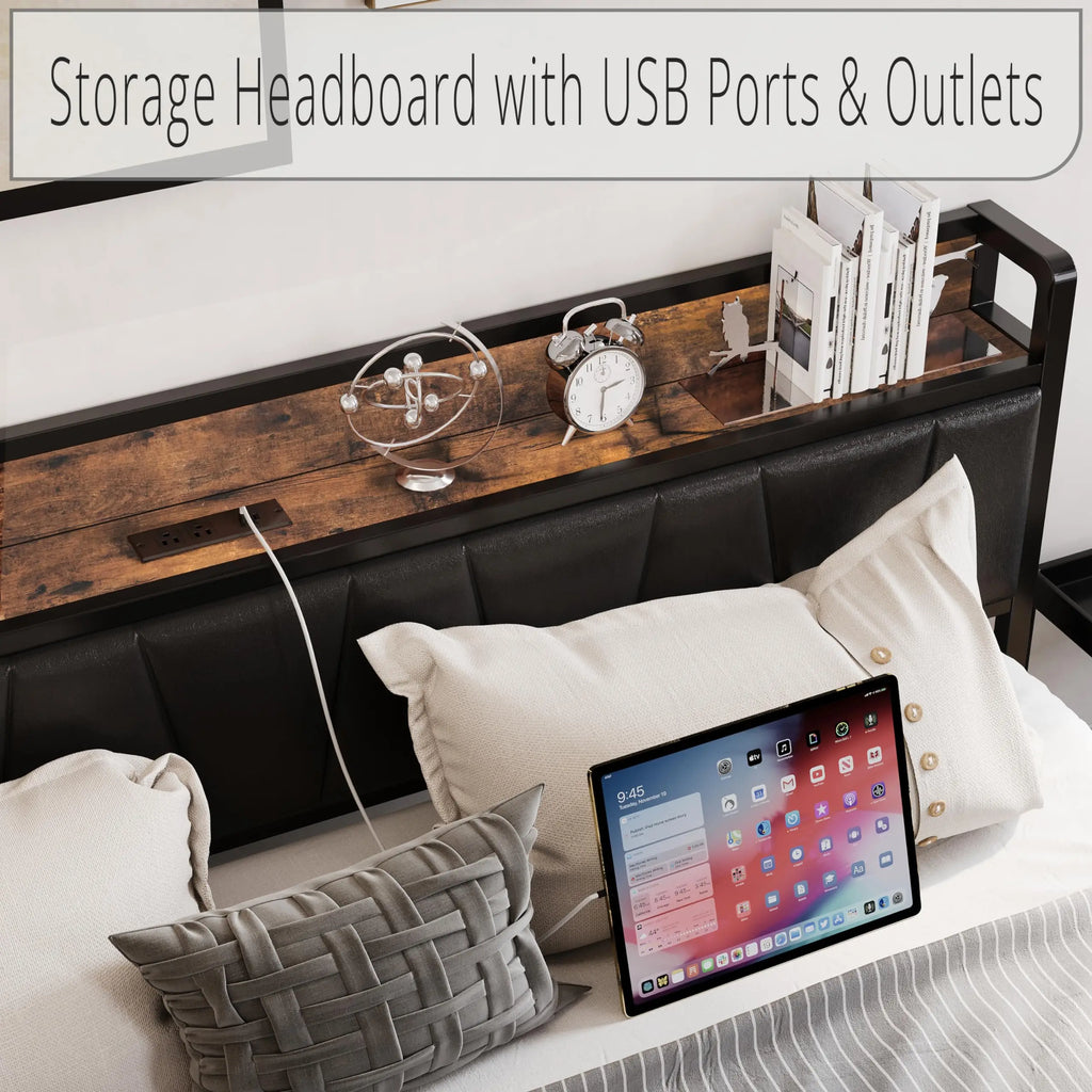 Queen Bed Frame with Storage Headboard and Charging Station