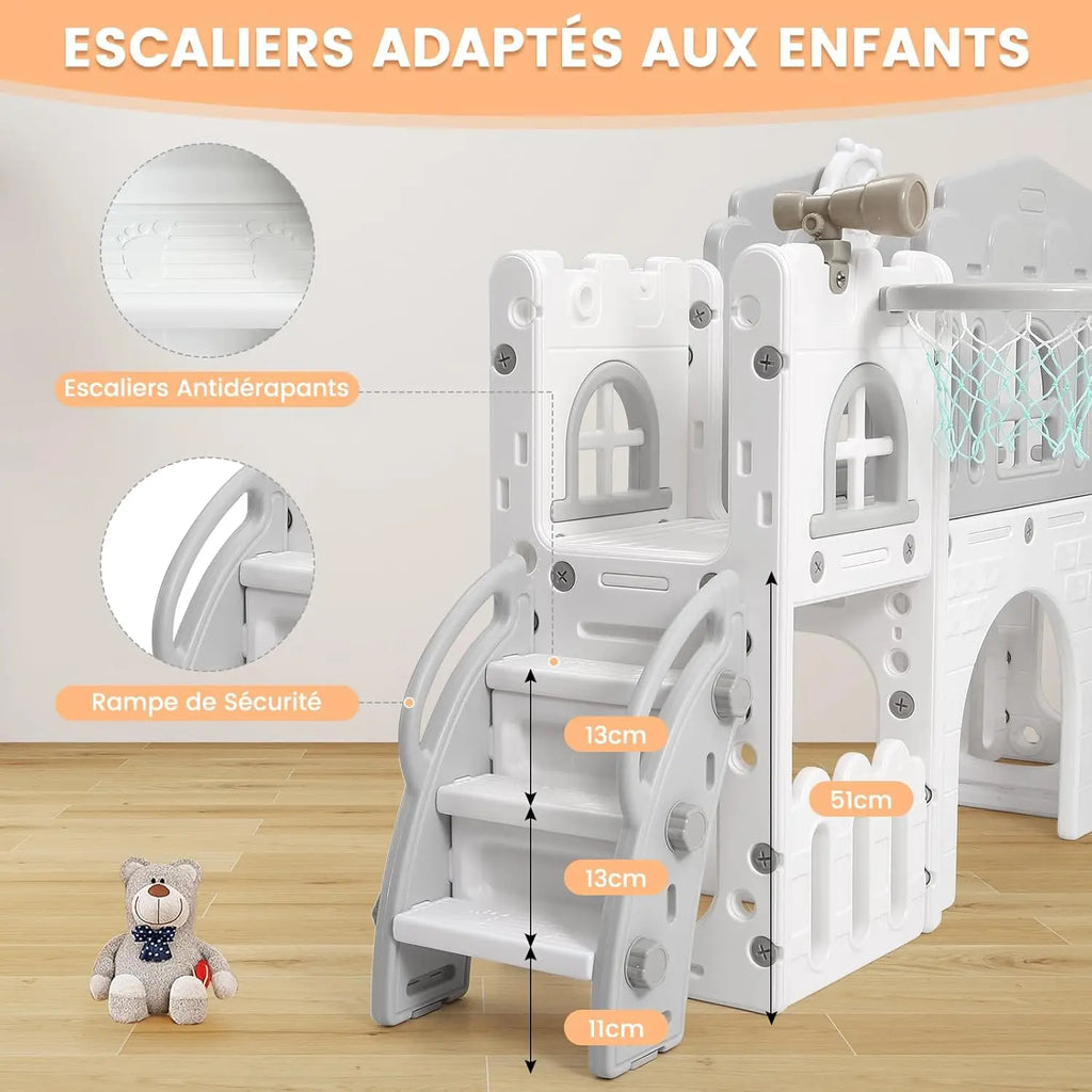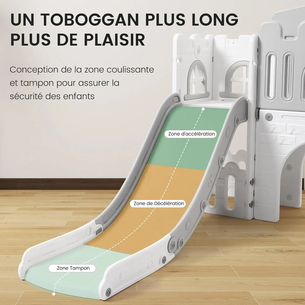 Extended & Stable Slide: Our slide features acceleration, deceleration, and buffer zones, enhancing the thrill while keeping children safe. The L-shaped slide and multiple ground support points ensure stability, preventing wobbling, tipping, or shifting during play.