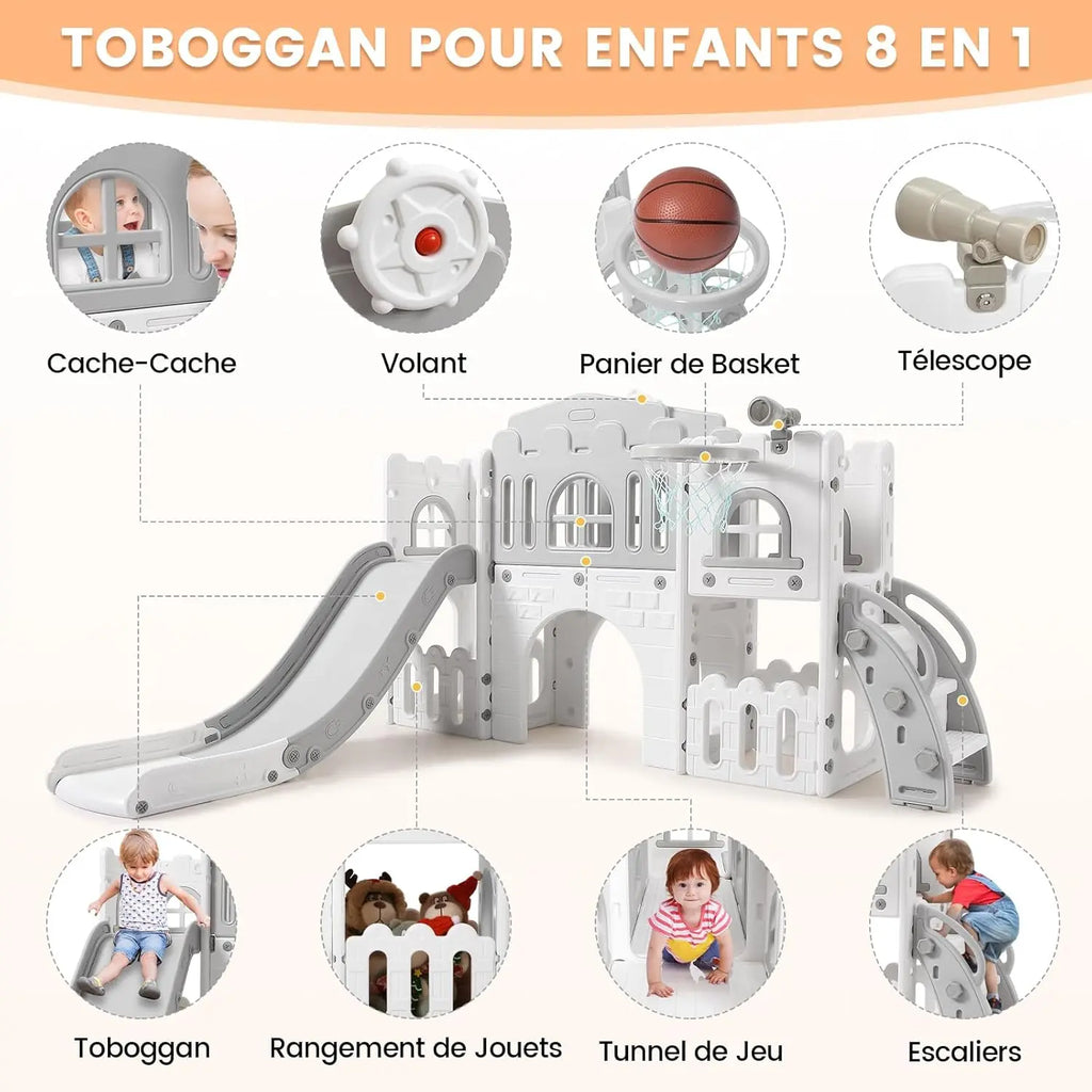 8 in 1 Design: The toddler slide combines a slide, basketball hoop, telescope, steering wheel, climbing ladder, and play tunnel. The variety of play areas let kids enjoy endless playground fun. It also includes two hide-and-seek spaces where children can store toys, books, and more.